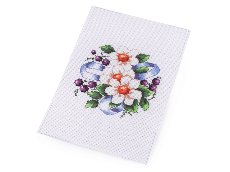 Set pentru brodat manual ce include material textil cu model imprimat, fire colorate corespunzător modelului și un ac pentru broderii.
