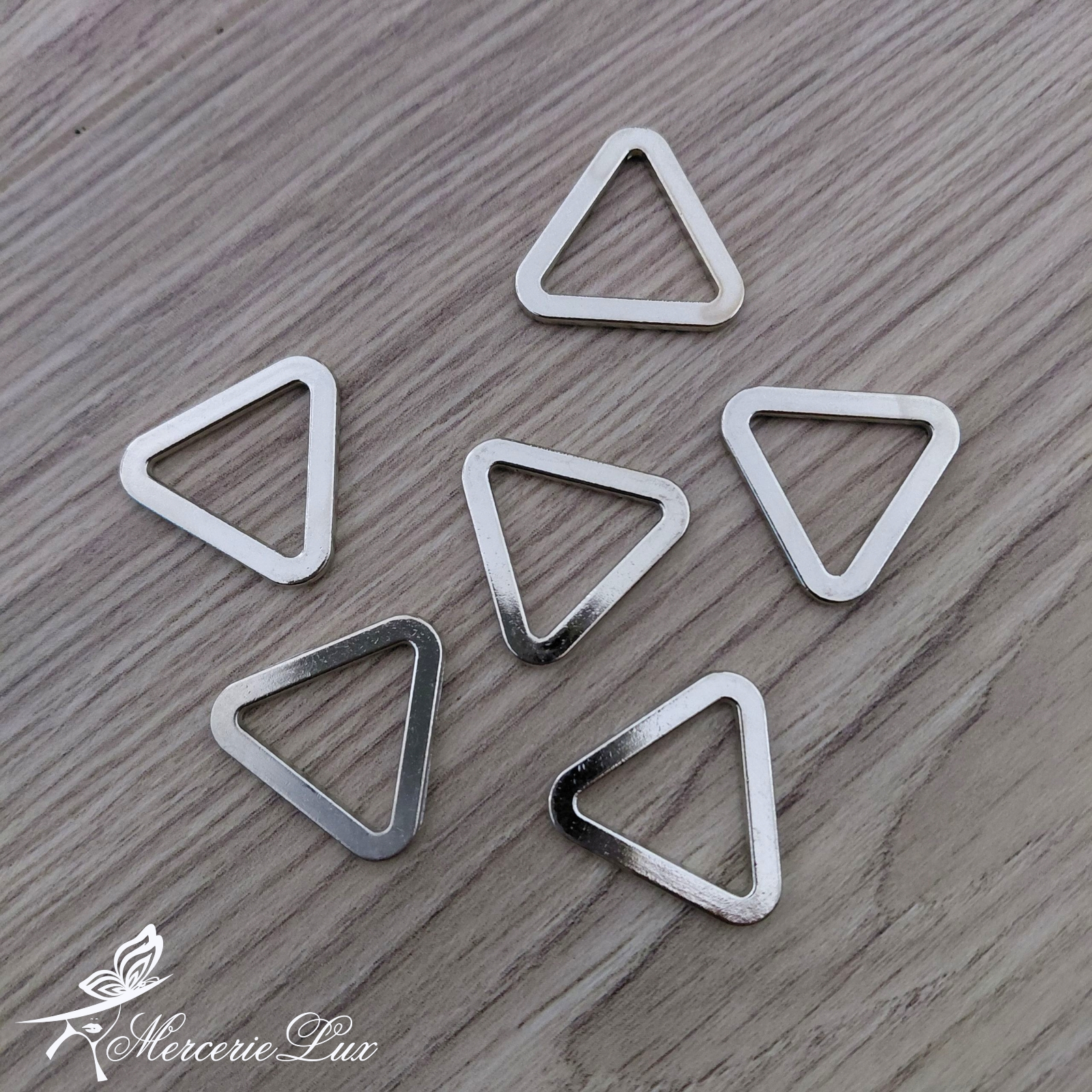 Accesoriu din metal argintiu, formă triunghiulară cu latura de 20mm folosit la decorarea diverselor confecții textile sau confecționarea genților, poșetelor, etc.