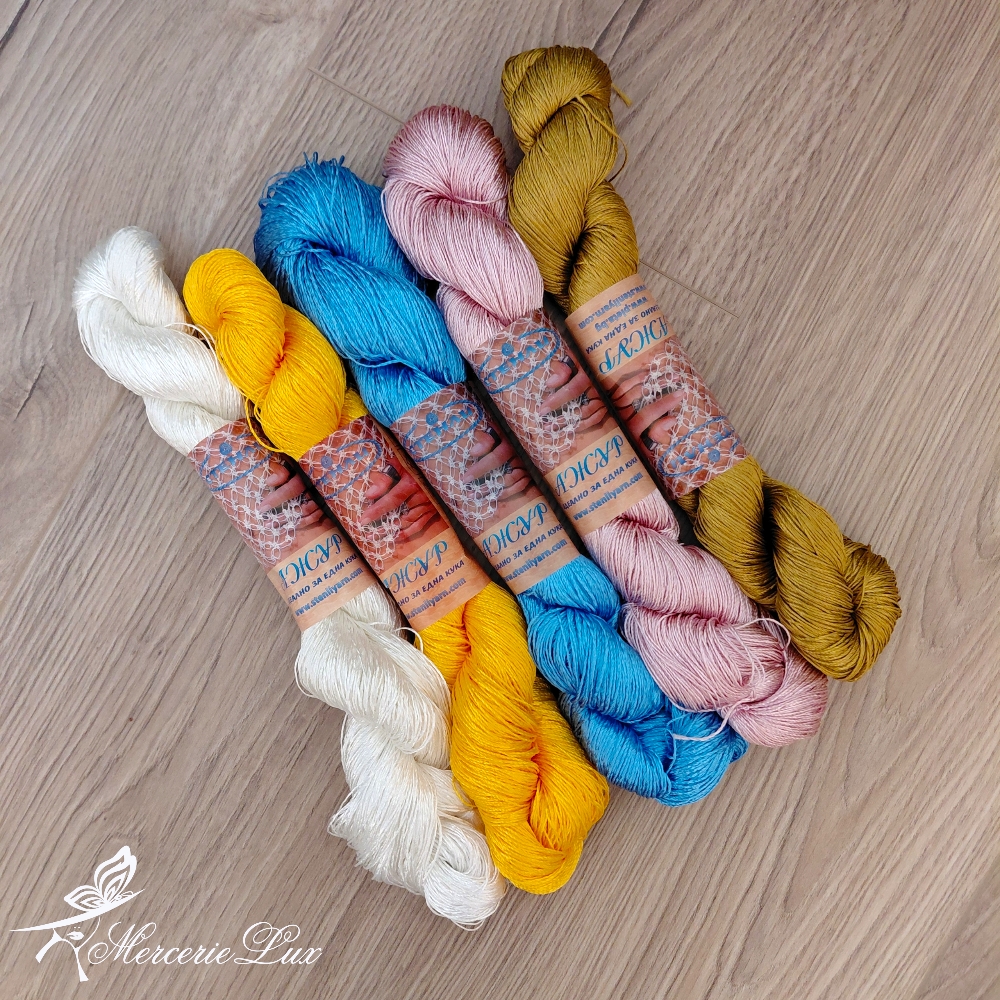 Fir subțire din vâscoză cu aspect satinat, lucios, moale și răcoros, potrivit pentru croșetat.