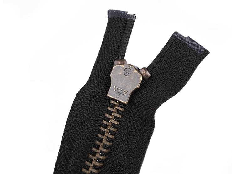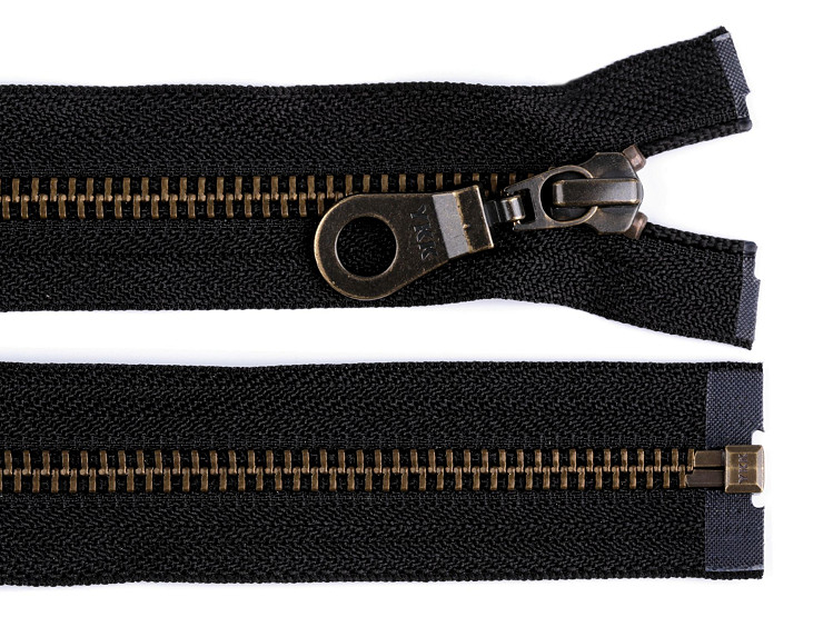 Fermoar cu dinți metalici alamă antică, detașabil, cursor cu autoblocare ce asigură o închidere sigură.