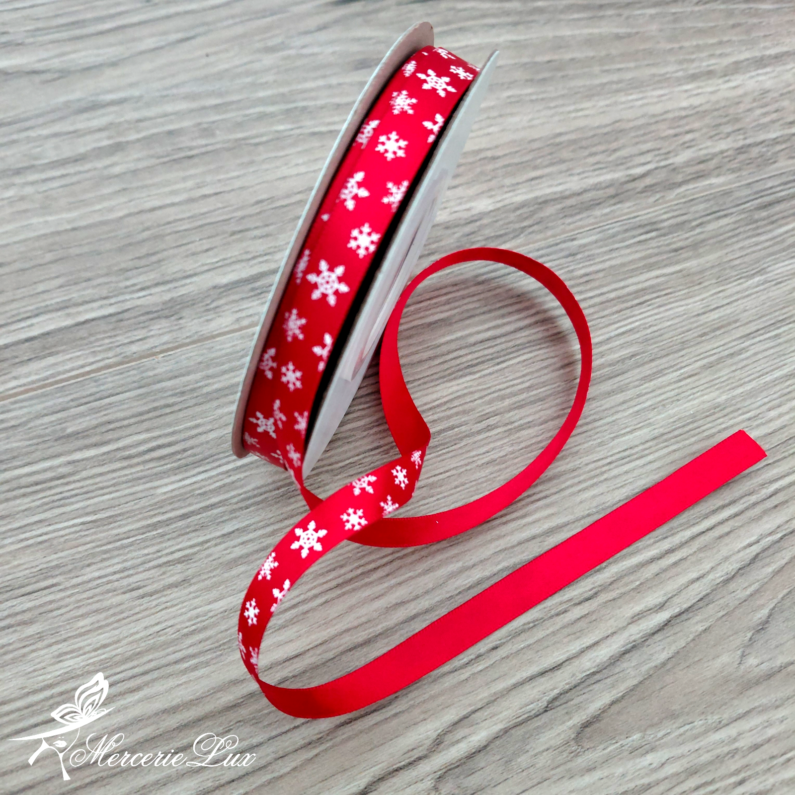 Panglică îngustă roșie satinată, imprimată cu fulgi mici de nea albi folosită pentru a realiza diverse decoruri de Sărbători.