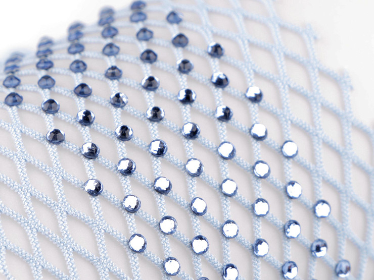 Plasă elastică cu strasuri, rezistentă, flexibilă, deosebită pentru a decora diverse confecții textile, rochii, bluze, tricouri, costume de dans.