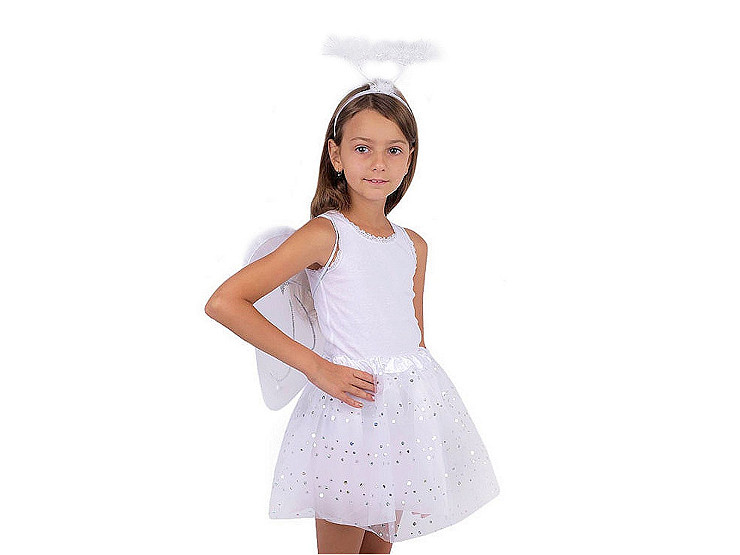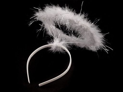Cordeluță cu cerc suspendat din sârmă îmbrăcată cu pene și fir lame argintiu folosită la costumația de înger pentru serbările copiilor, petreceri de hallowen sau alte reuniuni.