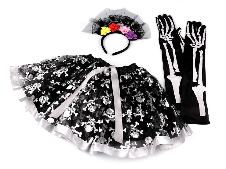 Este format din dintr-o fustă din tull, o bentiță impresionantă și mănuși.