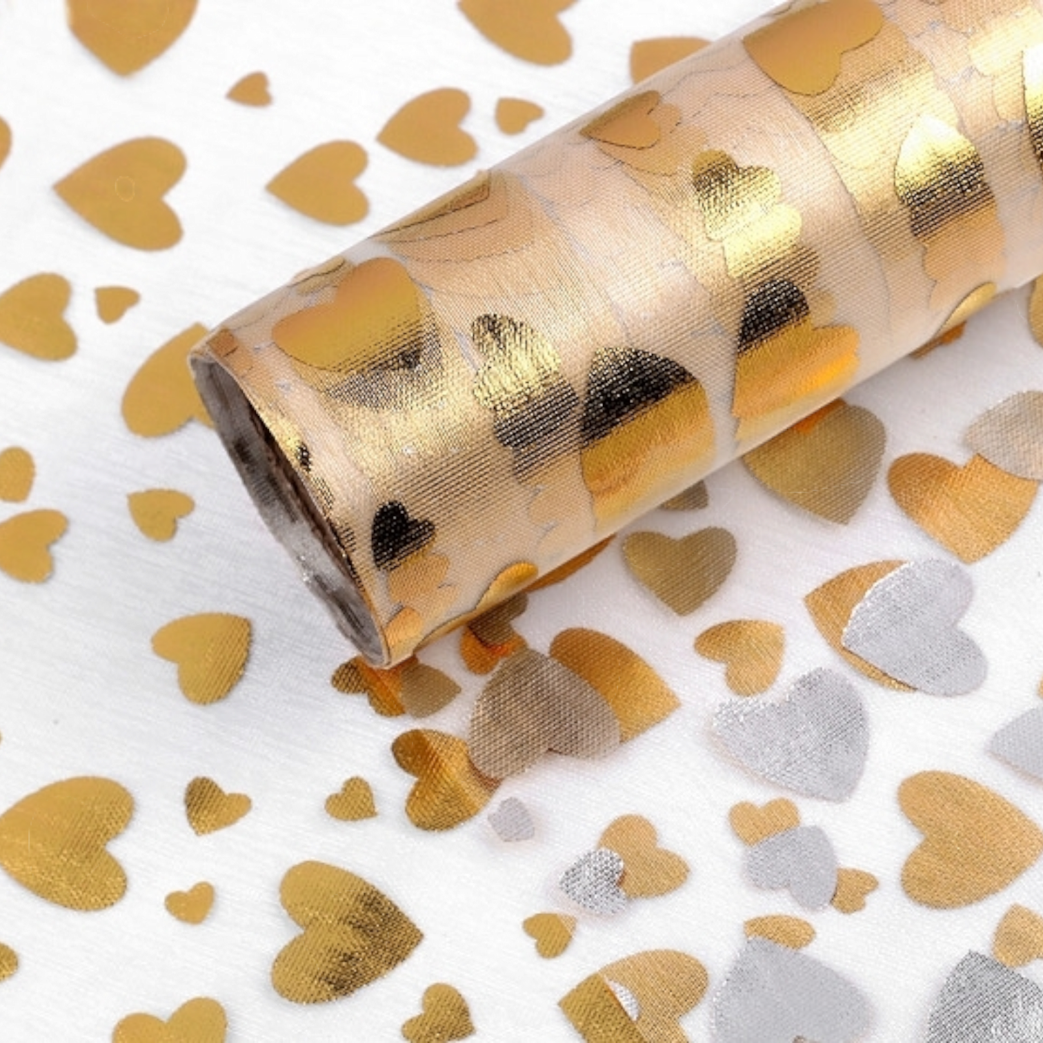 Bandă de organza cu imprimeu metalic auriu inimioare folosită la realizarea diferitelor decoruri de petrecere, carnaval.