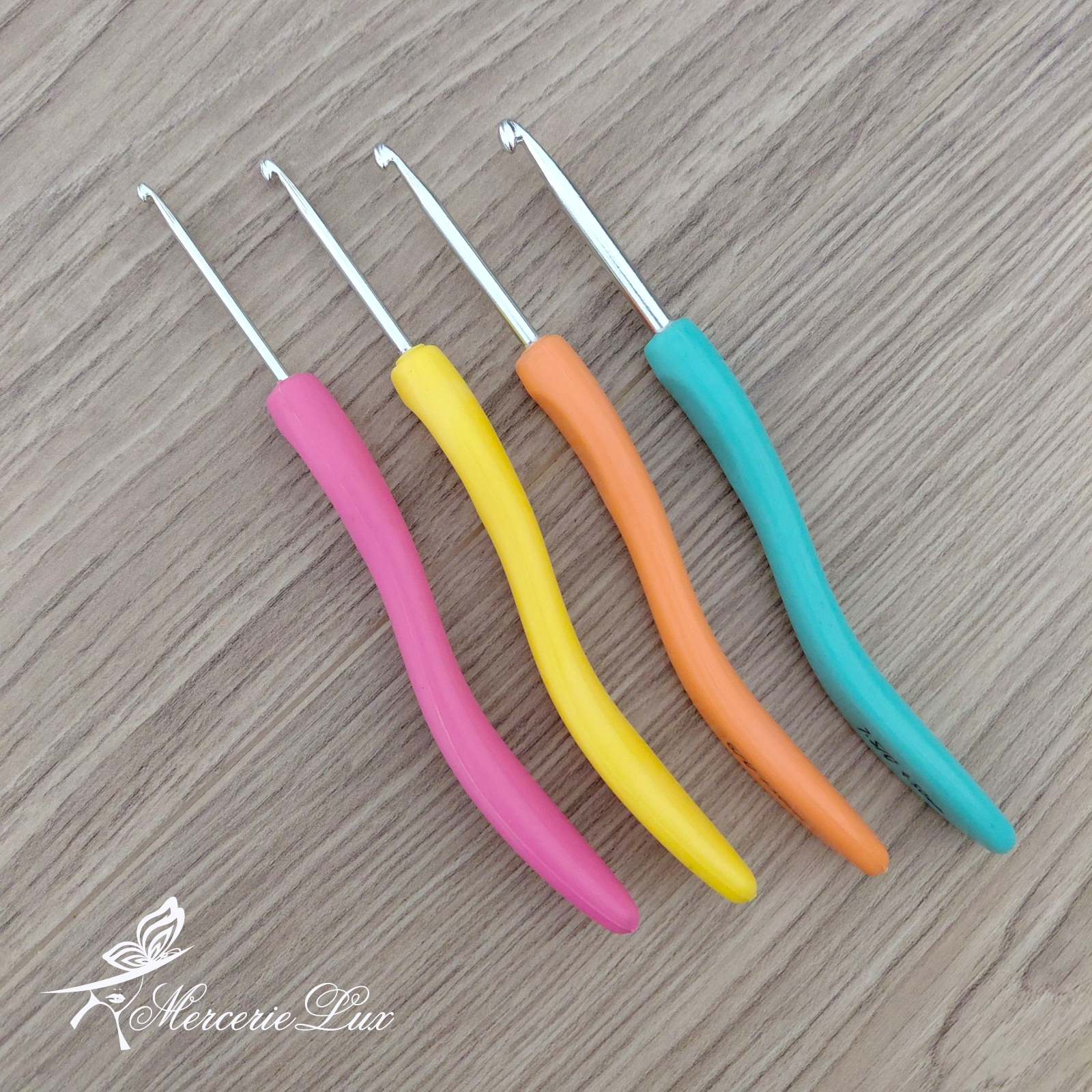 Croșete din aluminiu cu mâner din plastic, formă ergonomică pentru un croșetat confortabil.