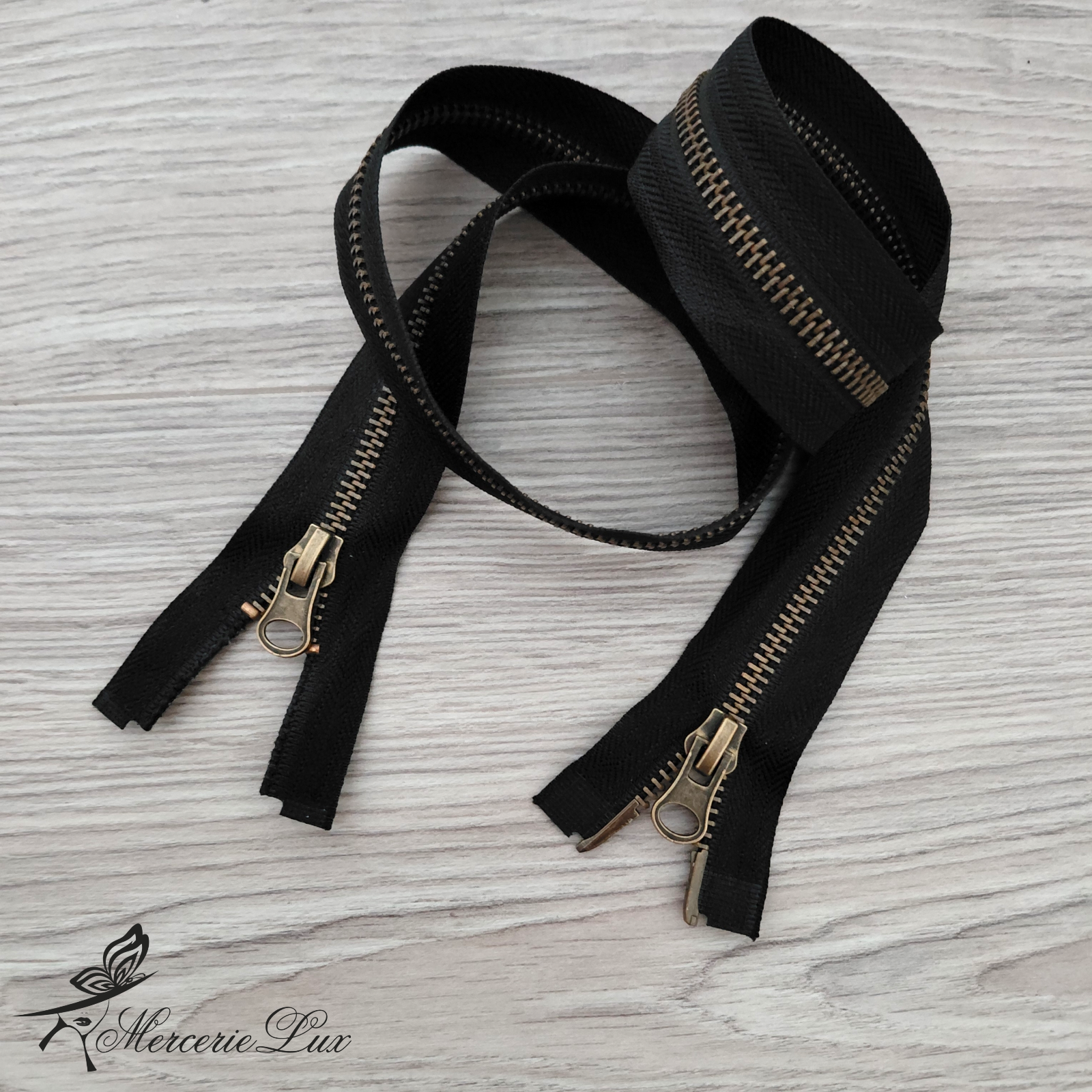 Fermoar cu dinți metalici din alamă antică și doi cursori ce permit deschiderea acestuia din ambele părți.