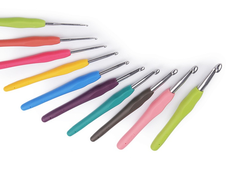 Set de 10 croșete metalice cu mânere din silicon, mărimi diferite.