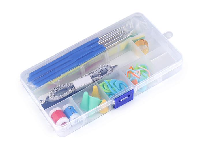 Set de croșetat și accesorii ajutătoare organizate într-o cutie de plastic transparentă.