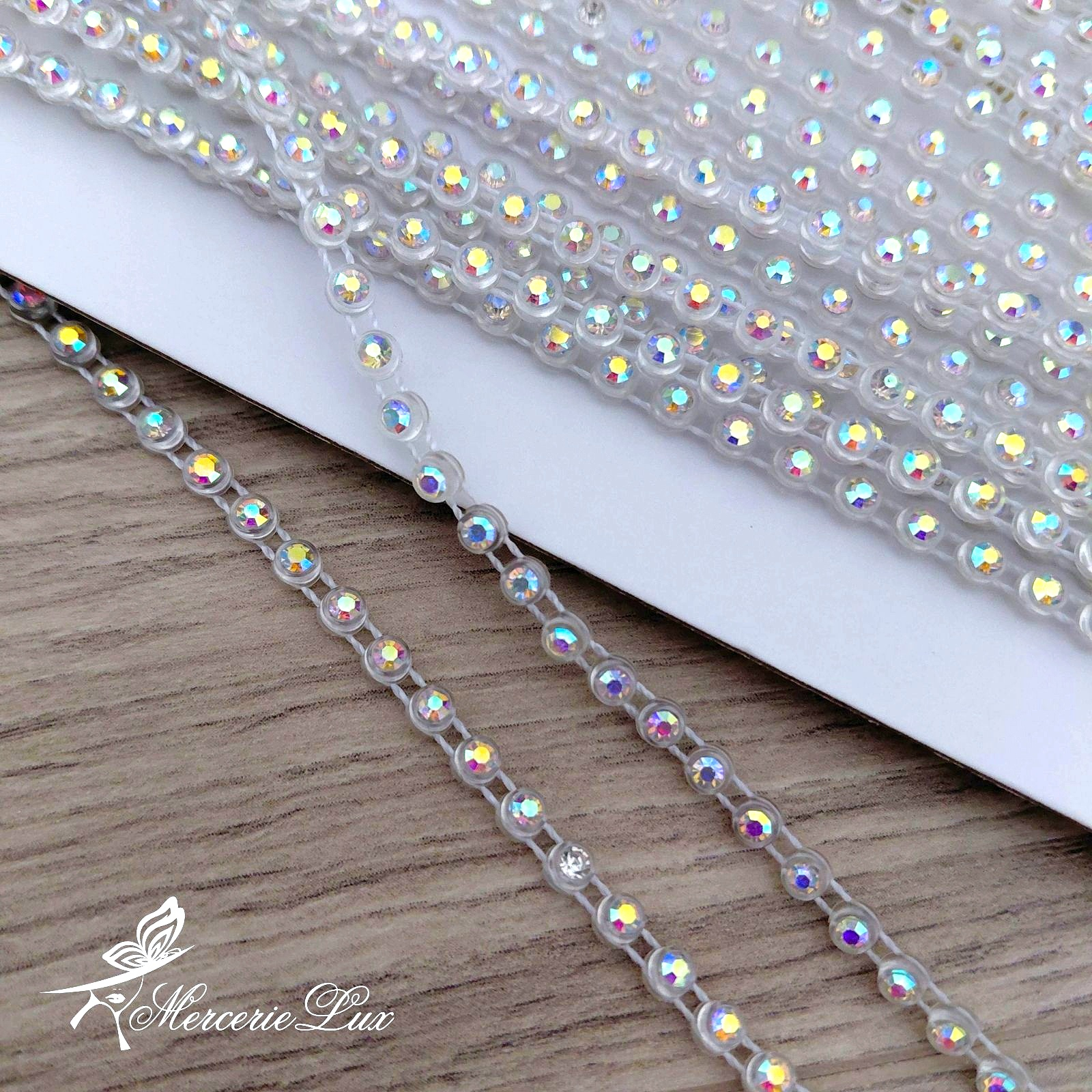 Ștrasuri din sticlă înșirate pe suport ață poliester, strălucitoare, decorative.
