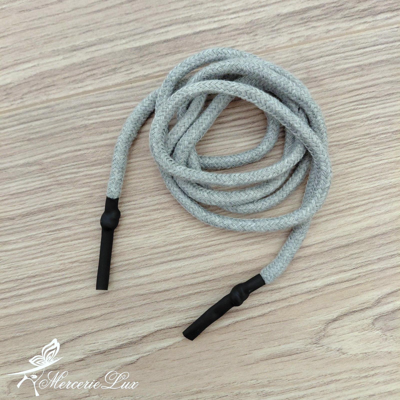 Șnur rotund din bumbac cu terminații din plastic moale, potrivit pentru jachete, hanorace, treninguri sau alte articole sport.